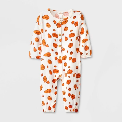 Dress up your baby in autumn style with the Autumn Gauze Long-Sleeve Romper from Cat & Jack™. This cream romper is covered with a printed pattern showcasing pumpkins, pears, leaves and more for seasonal style. Designed with front button-down style and crotch snaps, this long-sleeve romper allows easy dressing and changing. Best of all, this gauze romper is made with 100% cotton to help provide soft and breathable comfort from day to night.