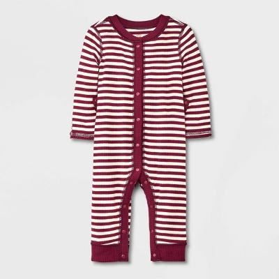 Add sweet, comfy style to your baby’s wardrobe with the Ribbed Snap Adaptive Romper from Cat & Jack™. Made with soft and stretchy fabric for comfortable wear, this long-sleeve romper is designed with front buttons and crotch snaps for easy dressing and changing. Specially designed for sensory needs, this ankle-length romper features flat seams and no tags to eliminate abrasion against the skin. Seams are intentionally chosen to withstand high level activity without irritating the skin. Garment care and size information is provided through heat seal labels, not itchy tags. This ribbed romper is covered with a striped pattern in dark red and cream for a cute look they can wear any time.
