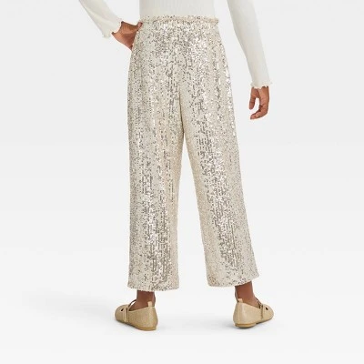 Help your kid create a glam holiday look with the Dressy Holiday Pants from Cat & Jack™. Designed in an ankle length, these dressy silver pants are covered with sequins for shiny appeal, and they feature a full elastic waistband for a snug fit. Made from a soft and stretchy fabric in a flared fit with jersey lining, these mid-rise pants offer all-day comfort and fun pairing with their favorite tops.
