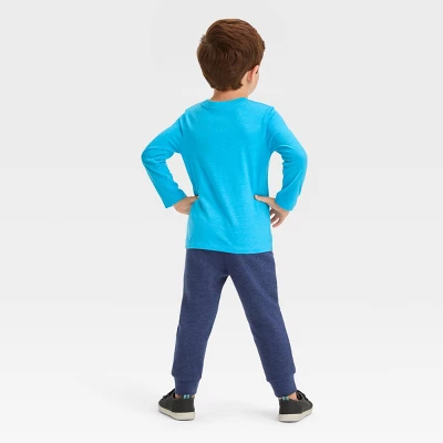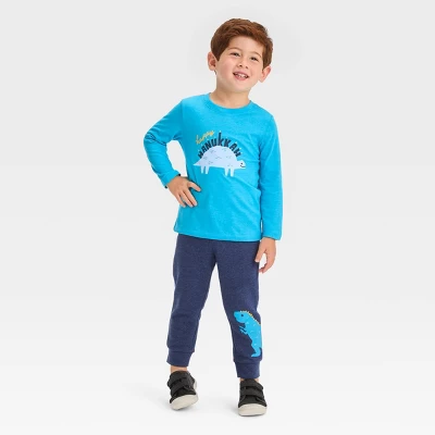 Get your toddler ready for Hanukkah in fun, festive style with this 2-Piece Long-Sleeve Graphic T-Shirt and Fleece Jogger Set from Cat & Jack™. This outfit set includes a long-sleeve pullover featuring a dinosaur with the message “Happy Hanukkah” on the top, while the jogger pants showcases a dinosaur on the leg for a fun look. Plus, the banded cuffs offer a snug fit. The set is crafted from cotton-blend fabric to offer comfort, and you can easily pair the pieces with other clothing in their wardrobe to change their look.