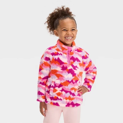 Add a fun splash of color and sweet style to your little one’s wardrobe with this Quarter Zip-Up Jacket from Cat & Jack™. The long-sleeve fuzzy jacket features a casual, below-hip fit and is made of lightweight faux shearling with a vibrant abstract print in pink, orange, light purple and white shades. A cozy mock turtleneck with a quarter-length zipper and side welt pockets complete the design with functional flair and an elevated look.
